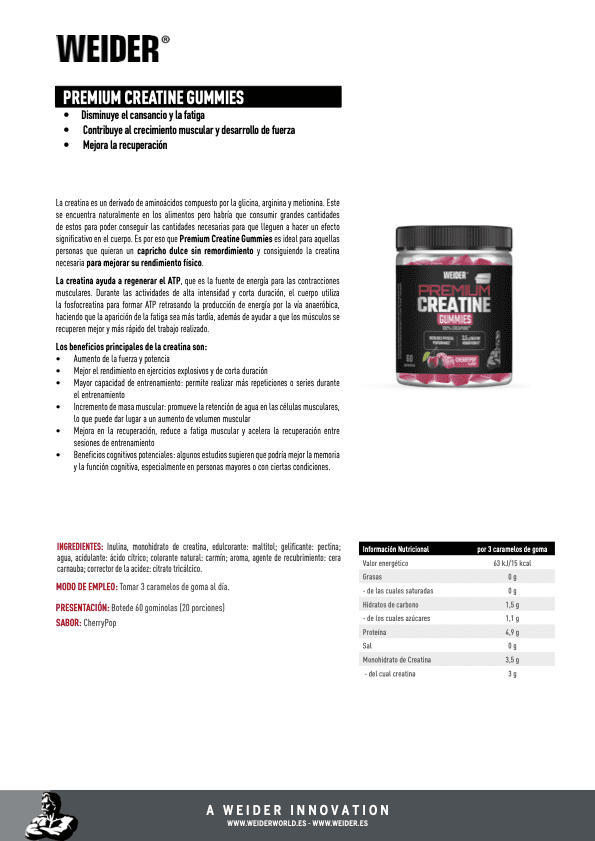 Descubre el poder de la creatina en su forma más práctica y sabrosa. Premium Creatine Gummies te ofrece todo lo que necesitas para maximizar tu rendimiento físico mientras disfrutas de un dulce placer sin remordimientos. Estas gominolas están diseñadas para quienes buscan mejorar su fuerza, resistencia y recuperación muscular de manera cómoda y deliciosa.